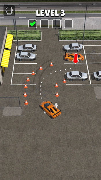 通过触屏或虚拟方向盘操控汽车行驶,精确调整方向和速度完成停车任务;