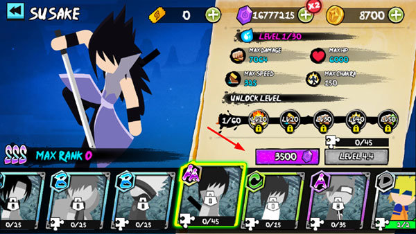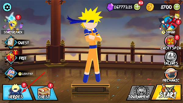 首先打开火柴人忍者大战4.1手机版,点击左下角在heroes;