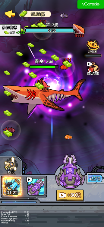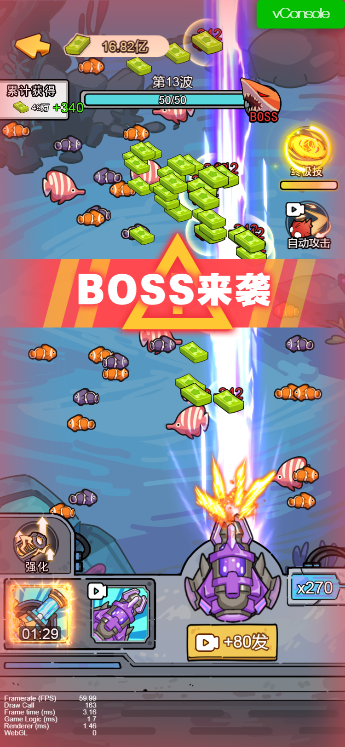 玩法:点击屏幕开炮,消灭50条鱼出现boss.打败boss进行下一波。每打三个boss会随机掉落一个宝物(会在集宝界面展示)。消灭一定数量的鱼,可触发大招终极技紫色旋涡。点击强化可以进行武器强化,鱼类加成升级。