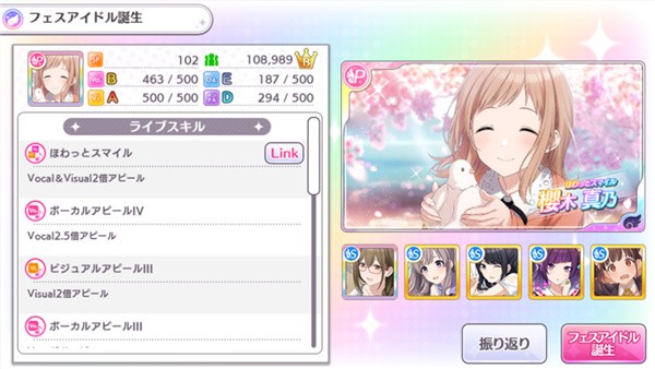 如果下次再想育成同一角色的话,必须从头开始再育成一次,上次育成的能力值不会继承下去。不过每一次育成,都可以让你对偶像的喜好、对话的正确选择,以及游戏的熟悉程度增加,下次育成就更易得到强大的Fes偶像。