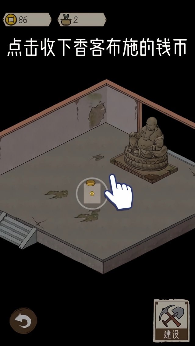 耐心等待香客进入天王殿内,面对破烂不堪的天王殿内部,可以点击【建设】按钮来改善天王殿的环境。