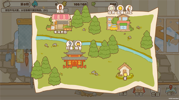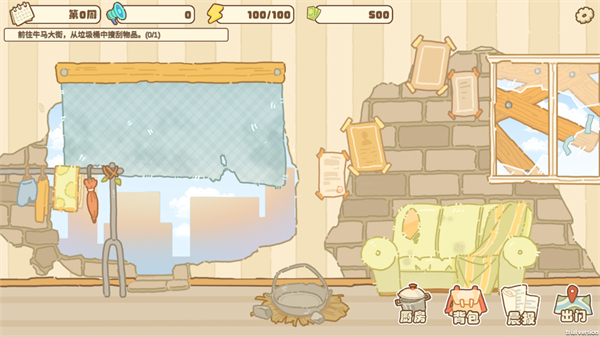 进入游戏界面后可以看到自己的居住环境,在下面还有厨房、背包、晨报和出门选项,点击出门;