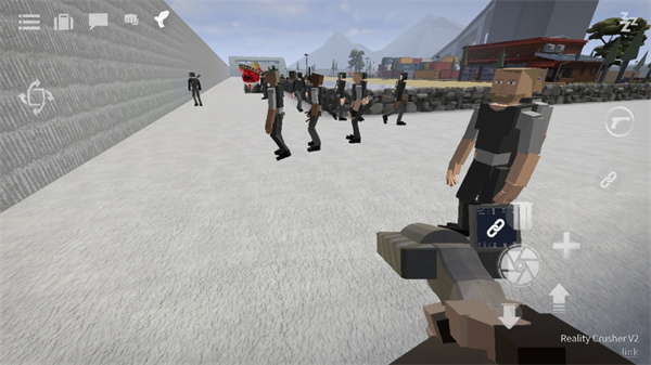 点击右边“手枪”按钮拿枪,可以让角色切换到持枪状态,中心用于开枪,+号可以新增靶子角色。
