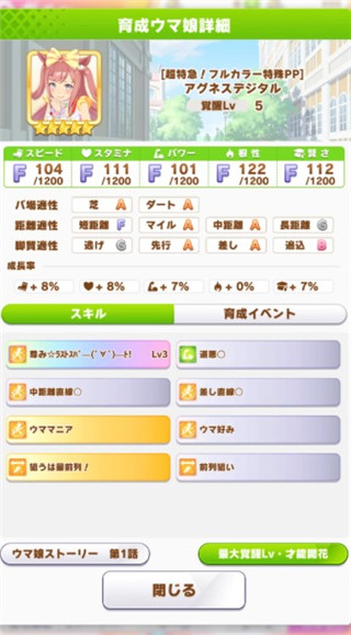 自身不错的模板,对训练的适应性(特别是速度适应性)非常贴合。前期针对短距离比赛可以获得大量粉丝在后半部分可能会因为连续的比赛导致体力不支,我们在提升主属性速度的前提下,可以适当提升智力学一下技能总的来说培养就是速度+短距离+冲刺技能的良心简单搭配