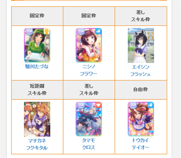 乌拉拉(春丽):游戏中少有的泥马,在泥地比赛可以获得更多的粉丝。同时,因为是差马但是又是短距离型导致育成的目标相对其他马来说更低更容易达成。同样训练难度低,技能学习参考更多插入/冲刺型技能。