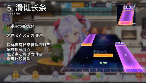 长条note的变体,末尾节点必定为滑键,同样拥有长条特殊的判定,同样拥有节点,但节点还可以为滑键,滑键比较特殊。