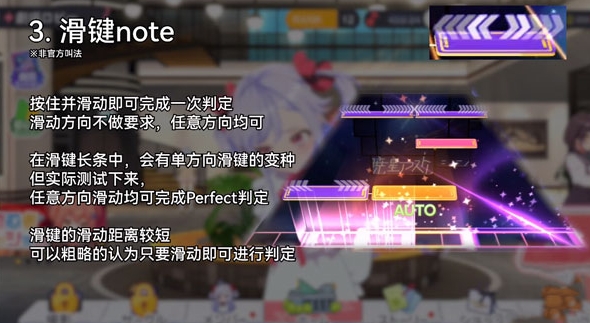 按住并滑动即可完成一次判定滑动方向不做要求,任意方向均可,在滑键长条中,会有单方向滑键的变种但实际测试下来,任意方向滑动均可完成Perfect判定。