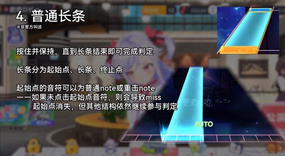 按住并保持,直到长条结束即可完成判定,长条分为起始点、长条、终止点。