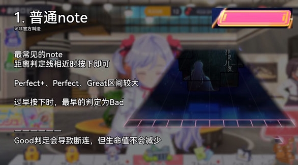 最常见的note,距离判定线相近时按下即可,Perfect+、Perfect、Great区间较大,过早按下时,最早的判定为Bad。