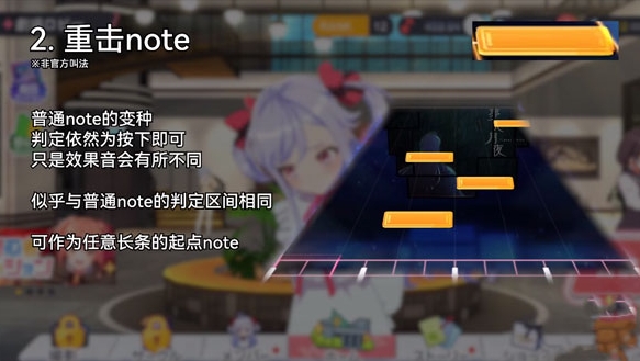 普通note的变种,判定依然为按下即可,只是效果音会有所不同,似乎与普通note的判定区间相同,可作为任意长条的起点note。
