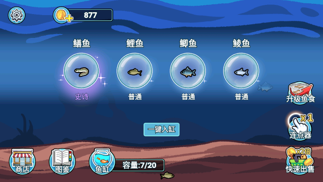 2、养成:通过喂食和培育,让鱼儿不断成长,解锁更多品种;