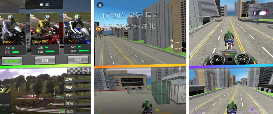 2.您可以选择四款各具特色的摩托车,在赛道上驰骋,展示您的绝技。
