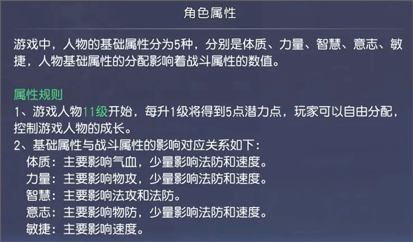 角色的属性一共分为五种体质、力量、智慧、意志、敏捷每种属性都会影响角色的属性数值,也可以通过洗点或后续升级加点改变角色的属性重心,自由选择角色的成长方向(新手建议根据角色本身的定位进行加点哦)