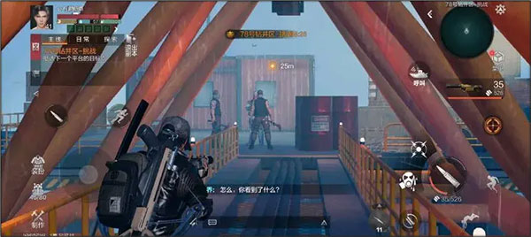 1、第二个平台主要依靠油桶进行输出。在第二张图中,准星所指之处,能看到藏在枪手身后的油桶。当遭遇自爆兵时,在其靠近并举手的瞬间,可往反方向翻滚以躲避。