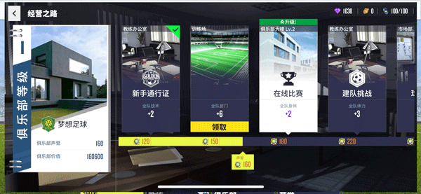 3、于“经营之路”页面,你能够看到俱乐部名称、俱乐部等级、俱乐部声誉以及俱乐部价值等基本信息。页面右侧的声誉进度条,与游戏功能的解锁进度相对应。就像上图呈现的那样,当俱乐部声誉达到180,“在线比赛”功能便会解锁。此时,或许又会有玩家发问:“声誉要怎么获取呢?”