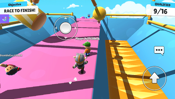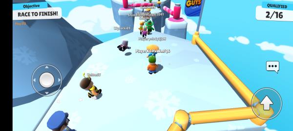 6、在游戏中,玩家依靠虚拟按键来操控人物移动。右侧按键,单击可实现“跳跃”动作,双击则会触发“向前扑”。游戏设有三轮障碍赛道(即地图),每轮赛事结束时,凡是成功抵达终点线或者顺利越过障碍的玩家,都能晋级下一轮,如此循环,直至产生最终的冠军。