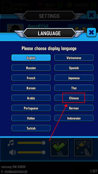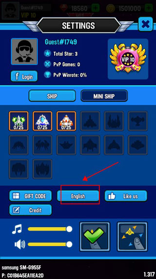 首次进入游戏后,先简要浏览一下游戏教程,接着返回主界面,点击左上方的“头像”,随后点击“English”,具体位置如以下箭头所指。