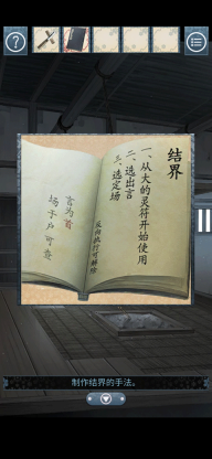 打开柜子以后用刀划开,得到符咒和场地,根据书里的内容反向操作,正常按照符咒首字来读,应该是来春去冬,反过来就是冬去春来,把冬去春来输入到场地里,减轻门上的力量,然后根据从大的符咒开始按反过来,就是从小的符咒开始点,从小到大点完以后门开,剧情。