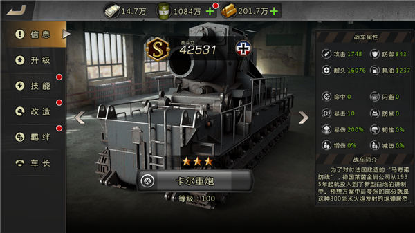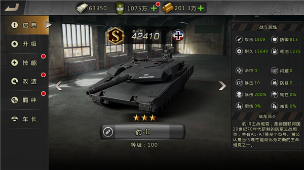 主战炮:发射主战炮,对敌军前排造成200%+200伤害并降低10%防御和免伤,持续6秒