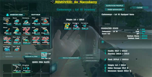 当我们将恐龙打晕之后,恐龙头上会出现一个带有紫色条的对话框,然后按e打开我们的背包,然后将食物投放到中间恐龙的背包当中,恐龙会吃掉这些食物,但是恐龙的负重是有上限的;