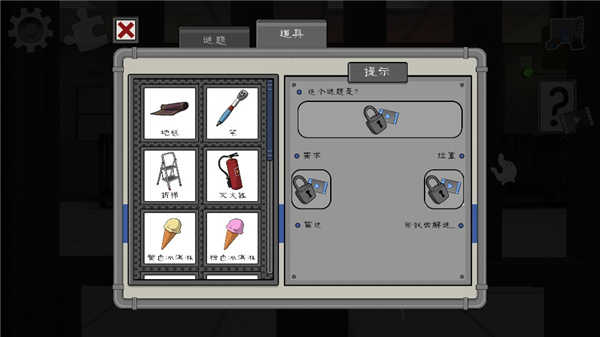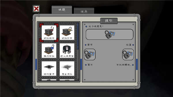 你可以点击提示,了解游戏中的玩法技巧,例如:怎样把锁破坏,强行开锁等等。