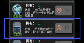 取款机:通过摆放炮台可以去偷取金币,获得去取款机即可偷取金币,从而达到升级效果,在商店中购买取款机。