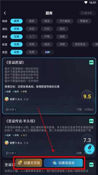 3、选择剧本后,选择一个房间类型创建,房间创建的步骤是一样的,只是玩法不同。