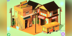 3、然后摆放一些装饰,左边的房子有个杂货铺的牌子在房顶上,右边的是零食屋