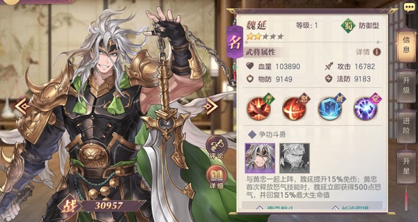 前期资源紧张时,投入少量资源就能让魏延能打能抗;但是据我脑测,魏延作为核心去养也是很犀利的,因为防御将是受到普攻时回怒,当魏延的前排队友全部倒下,敌人大量的普攻打在魏延身上,能让魏延经常释放怒攻造成伤害和回复!
