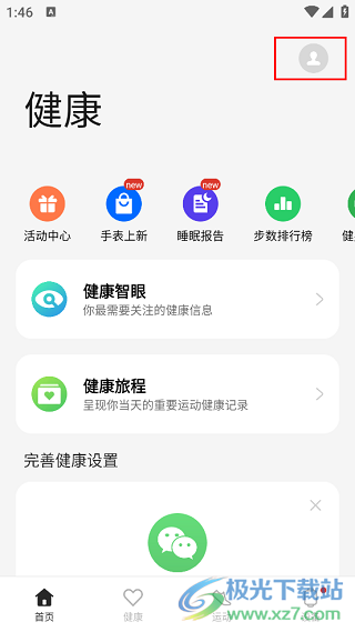 1、打开手机中的欢太健康,在主页面中需要点击右上角的头像框。