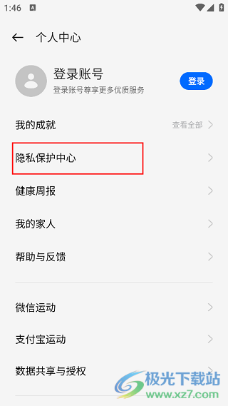 2、进入到“个人中心”界面之后,点击选项列表中的“隐私保护中心”。