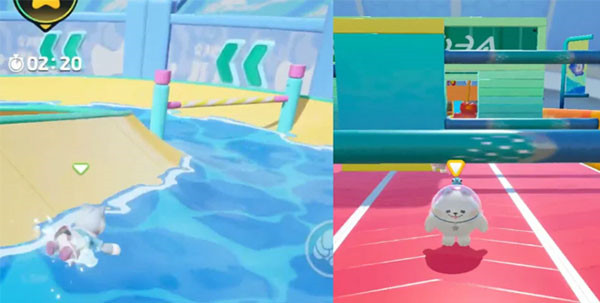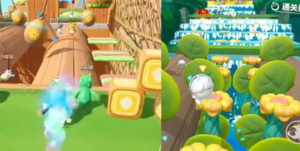 在元梦的【蹦蹦山谷】地图中,以山谷作为背景,并以弹跳为主的游戏机制,还添加了箱子、滚木和波形障碍等元素。而蛋仔的【山谷跃动】则以绿色山谷和清澈瀑布为背景,同样需要通过跳跃和翻越地形来克服滚木障碍。尽管两张地图在元素上有些相似,但笔者认为蛋仔的画面更加清新可爱。