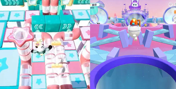 元梦【惊奇探险】汇集了众多障碍元素,并以在Y轴方向上的多层次赛道设计为特色。玩家可以选择走上层赛道以加快通关速度,或者在从上层掉落之后,通过下层赛道继续前进。这种设计在蛋仔的许多地图中都能找到,例如【气球城堡】这张图就非常典型,玩家可以通过上层跳板迅速通关,即使掉下来后,也能利用下层跳板继续向上攀爬。