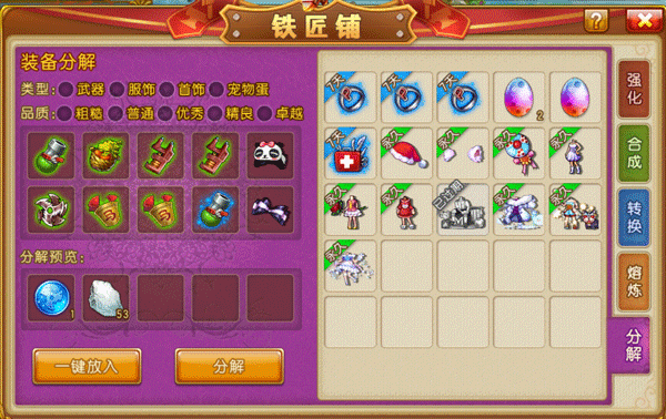 通过拆解武器、服装、头饰和辅助装备,我们可以得到大量的强化石。玩家们可以通过武器扭蛋获取许多武器,从而分解出大量强化石。扭蛋不仅能让我们得到心仪的图鉴,还能助力我们的强化进程。