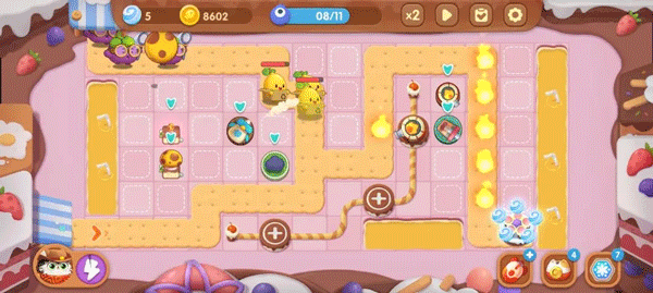 在此刻,我们需要奶茶塔来提供额外的伤害输出。虽然蘑菇塔擅长群体攻击,但由于其攻击速度较慢,并不适合针对单一Boss进行集中攻击。因此,我们应该将奶茶塔部署在我们的糖果周围,以便于锁定并攻击Boss。