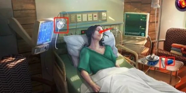 开始游戏时,首先点击女孩,然后获取耳镜和膏贴,并为她戴上氧气面罩。接下来,利用耳镜获取振颤器,获得振颤器之后,为女孩使用它,并确保最后按下绿色按钮。使用完振颤器后,点击墙上时钟,取出电池。随后点击桌子,获取剧情本和遥控器,以及关灯的开关。将遥控器、电池和膏贴组合成电视遥控器。然后用遥控器关闭电视,电视关闭后,再次点击女孩。点击女孩后,进入她的潜意识,首先拼出完整的图形。