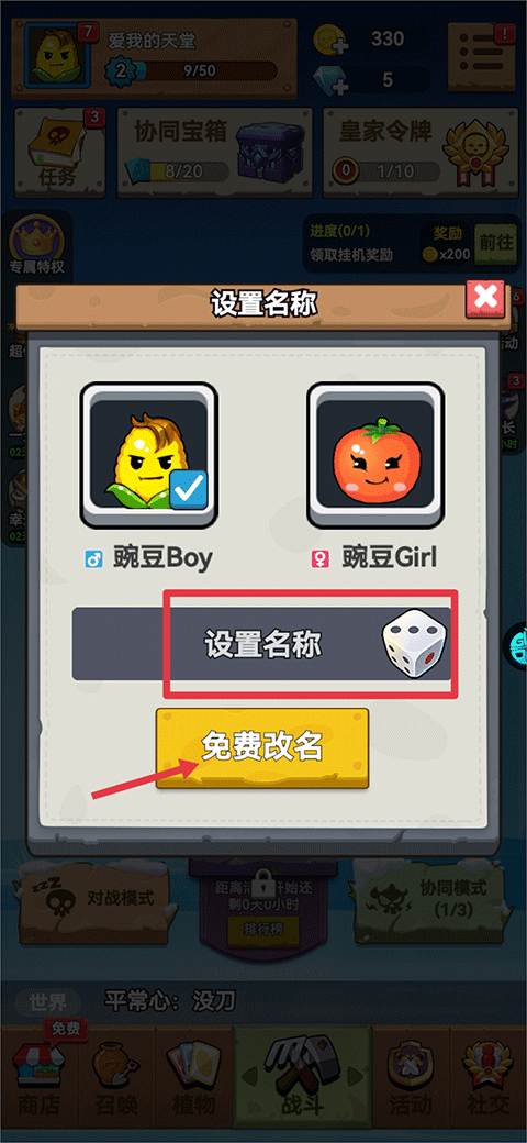 接着,输入你想修改的名字并点击免费改名按钮,如果找不到合适的名字,可以点击筛子图标来随机选择一个你喜欢的名字。