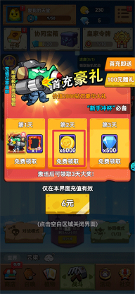 4、充值:玩家可以选择通过充值获取金币,并且在首次充值之后,还能获得首充大礼包,其中包含6000金币。