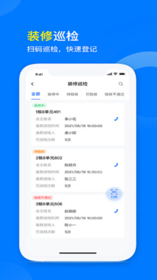 各种不同的装修巡检问题都可以在线上进行了解,各种不同信息的同步是非常及时的且支持快速登记哟。