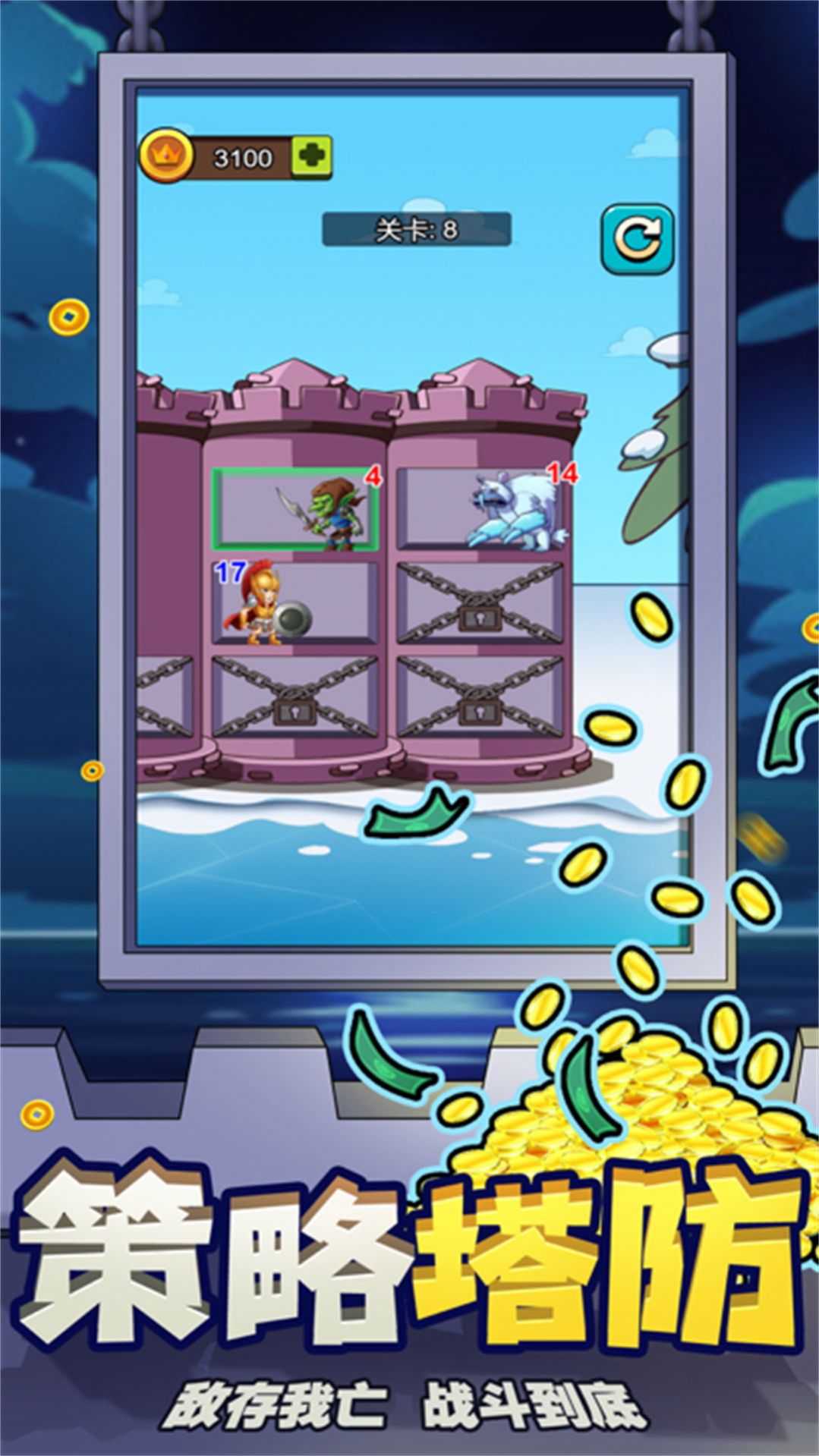 闯关爬塔升级战是一款策略塔防爬塔闯关游戏,通过一次次的战斗来不断的升级战士能力,每一场战斗都很有特色,控制着你的角色在各个场景中开始你的战斗冒险,激情热血的玩法随时开始冒险吧。