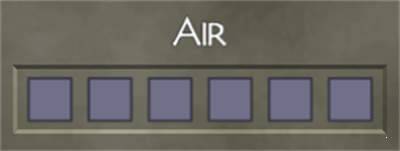 空气决定了角色的氧气量。这很重要,因为角色需要有足够的空气来呼吸。方块呈淡紫色,所有六个方块都出现了。但是,当角色在水下时,计量表会下降,并一直下降,直到计量表里没有方块为止。但是,一旦角色离开水面,计量表就会立即回到六。如果角色在高处停留时间过长或处于岩浆之下(尽管这是不可能的,因为岩浆很危险,可能会灼伤并最终杀死角色),角色也可能会失去空气。