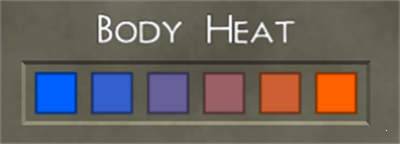 体温决定了角色的体感温度。最左边的方块是深天蓝色,而旁边的方块是深蓝色。中间左边的是淡紫色,中间右边的是橙红色。右边的方块略显橙色,最右边的方块是深橙色。体温应始终为前三个。如果淡紫色方块消失,则只显示 2,并显示“您感觉有点冷”的消息。如果只显示最左边的天蓝色方块,则角色将开始冻死,屏幕将开始冻结,直到角色再次变暖后才消失。