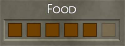 食物决定了角色的饥饿程度。角色需要进食才能生存。方块是棕色的,几乎不可能吃到全部六块。如果饥饿度下降到三块,就会出现一条消息“你有点饿了”。一旦达到 2 块,就会出现一条消息“该吃点东西了”,并会一直出现,直到达到 1 块,出现一条消息“你快饿死了”。如果饥饿度完全下降,角色就会失去生命值,并会一直失去生命值,直到死亡。