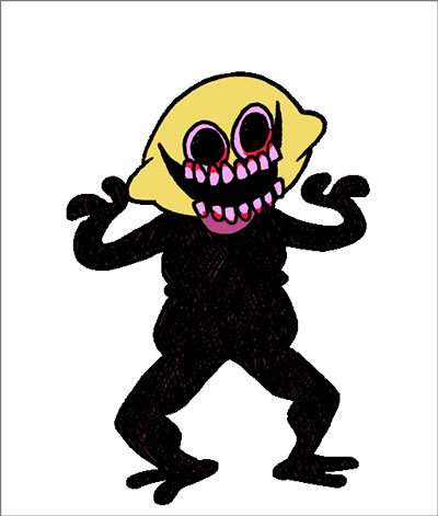 Monster似乎是一个恶魔般的人形生物,身体除了脖子外,大部分由黑色的涂鸦组成,而脖子则是紫粉色的。他的手和脚上都只有两根手(脚)指。他的头是柠檬的形状,双眼充血,黑色瞳孔大得诡异。他总是笑容满面,露出嘴里的浅粉色牙齿。鲜血染红了他的牙根和眼底