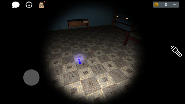 进入游戏,点击物品便可拾取,在初始状态,玩家拥有手电筒(可关闭),左上角分别是来聊天、设置、以及背包,用于游戏中收集线索道具;