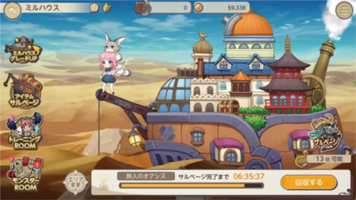 主角团的豪华大船,左侧的四个选项从上到下依次为:升级改造船(升级下面三项对应的数值)、探索得道具、放角色得经验、放宠物加经验(角色及宠物系统将在后文中解释),记得挂机