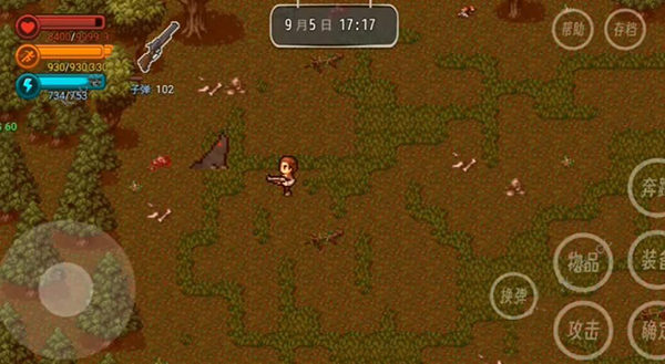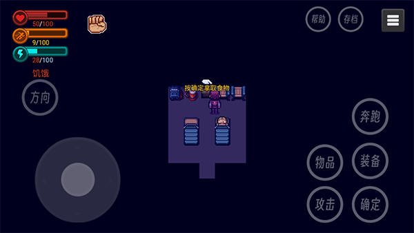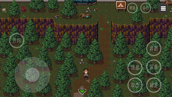 我们可以通过左下方按钮控制角色移动,右边包括物品、攻击、奔跑、装备、确定、帮助和存档等功能选项,
