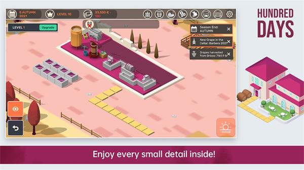 Hundred Days中文版是经营模拟游戏,大家经营葡萄庄园,进行酿酒,有三种游戏模式选择,了解酿酒过程,进行酒厂规模扩大。真实模拟游戏体验,还可以学习专业知识!