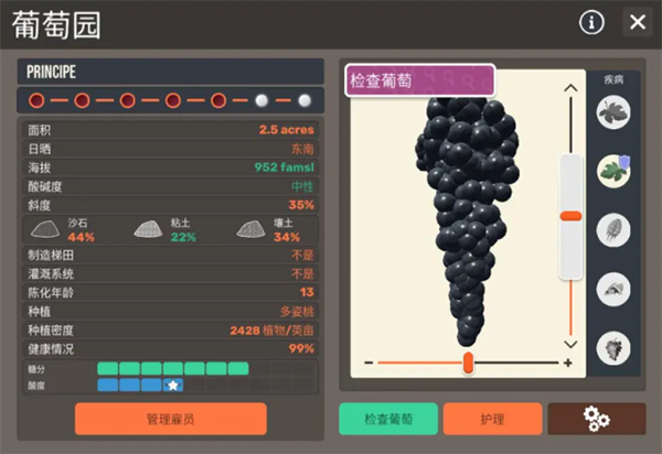 葡萄生长受土地特性影响。开始种植的选址决定了葡萄品种品质。其中土地特性分为海拔高度、土壤酸碱度、土壤成分(砂土、黏土、壤土)游戏中每块地的游戏特性会用三种颜色衡量,绿色》 橘色》红色)。 选址时尽量选择该品种下有至少2项绿色数值的土地。