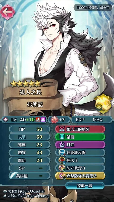 莱因哈特,蓝骑法。非常强力的蓝骑法,凭借一手神雷一直强到了现在。虽然不是真五英雄,但绝对值得优先练到40级。另外,有加攻性格的就优先使用加攻性格吧。我这里就按永远抽不到加攻性格来玩,用送的无性格莱因哈特。